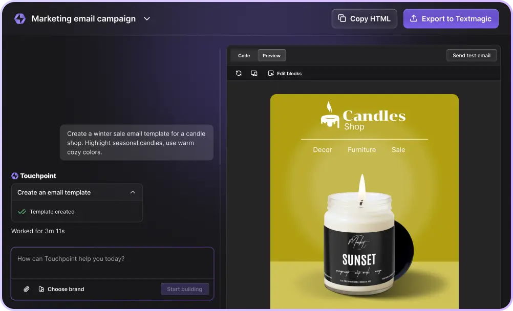 Chat with AI to turn a blank page into a polished email template in seconds — Touchpoint does the heavy lifting.